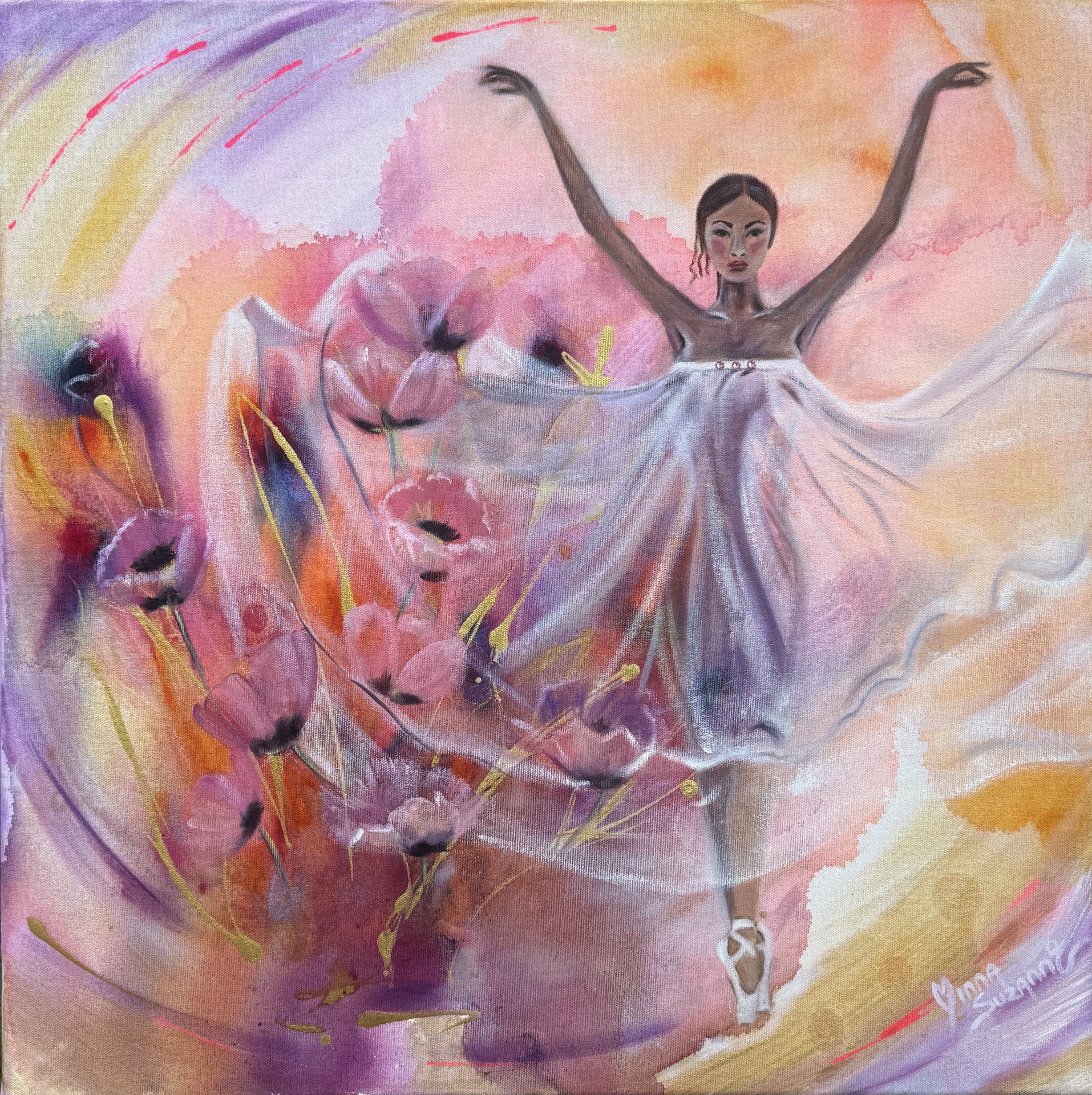 Queen of dance on 60cm x 60cm x3,8cm muste- ja öljyvärityö puuvillacanvakselle. Teos kertoo lempeästä, mutta itsevarmasta heittäytymisestä elämän tanssiin.